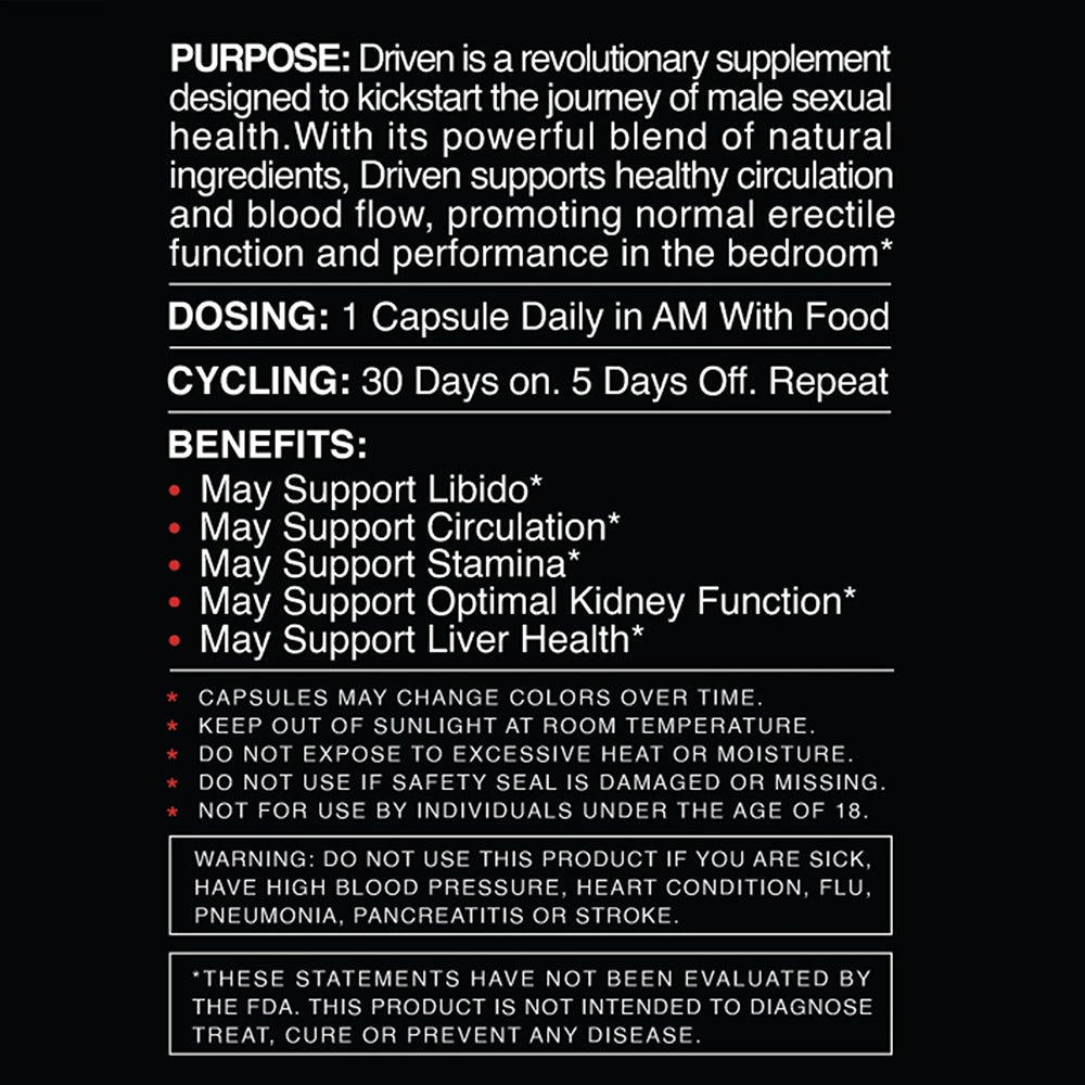 DRIVEN is a premium supplement formulated with a synergistic blend of traditional herbs, including Cnidium, Dodder Seed, Polygala, Schizandra, Cistanche, and Ginseng. This unique blend supports overall male vitality and promotes balanced energy, circulatory wellness, and optimal kidney and liver function.